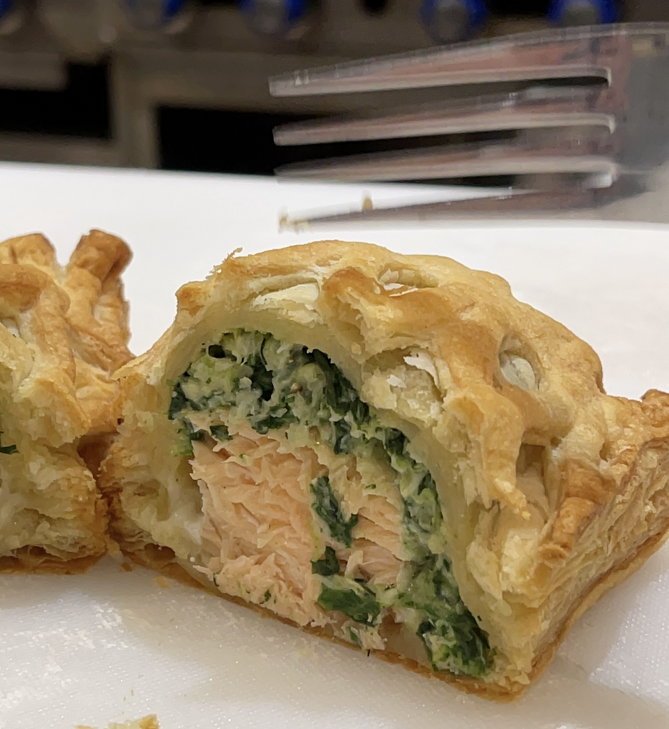 This In house Chef made Cape D’or Salmon Wellington features premium Cape D’or salmon combined with blue crab meat, cream cheese, spinach, garlic powder, dill, and lemon. Encased in a flaky puff pastry made from enriched wheat flour and a blend of vegetable oils, it offers a harmonious balance of rich flavors and textures, perfect for an elevated seafood dining experience.