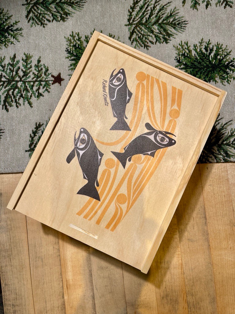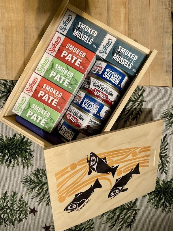 Succulent salmon on the inside, and beautifully illustrated salmon on the outside. The St. Jean’s Wooden Gift Box (Salmon) contains quality salmon products in a wooden box illustrated by Coast Salish artist Richard Krentz.